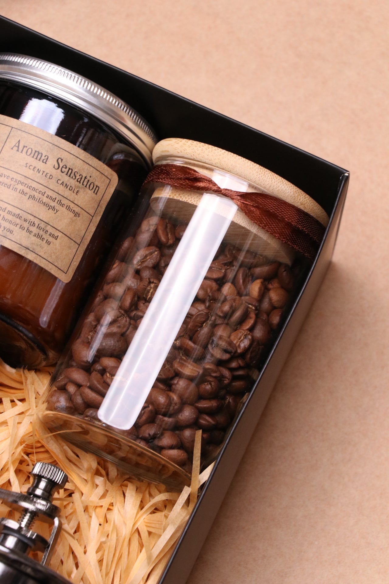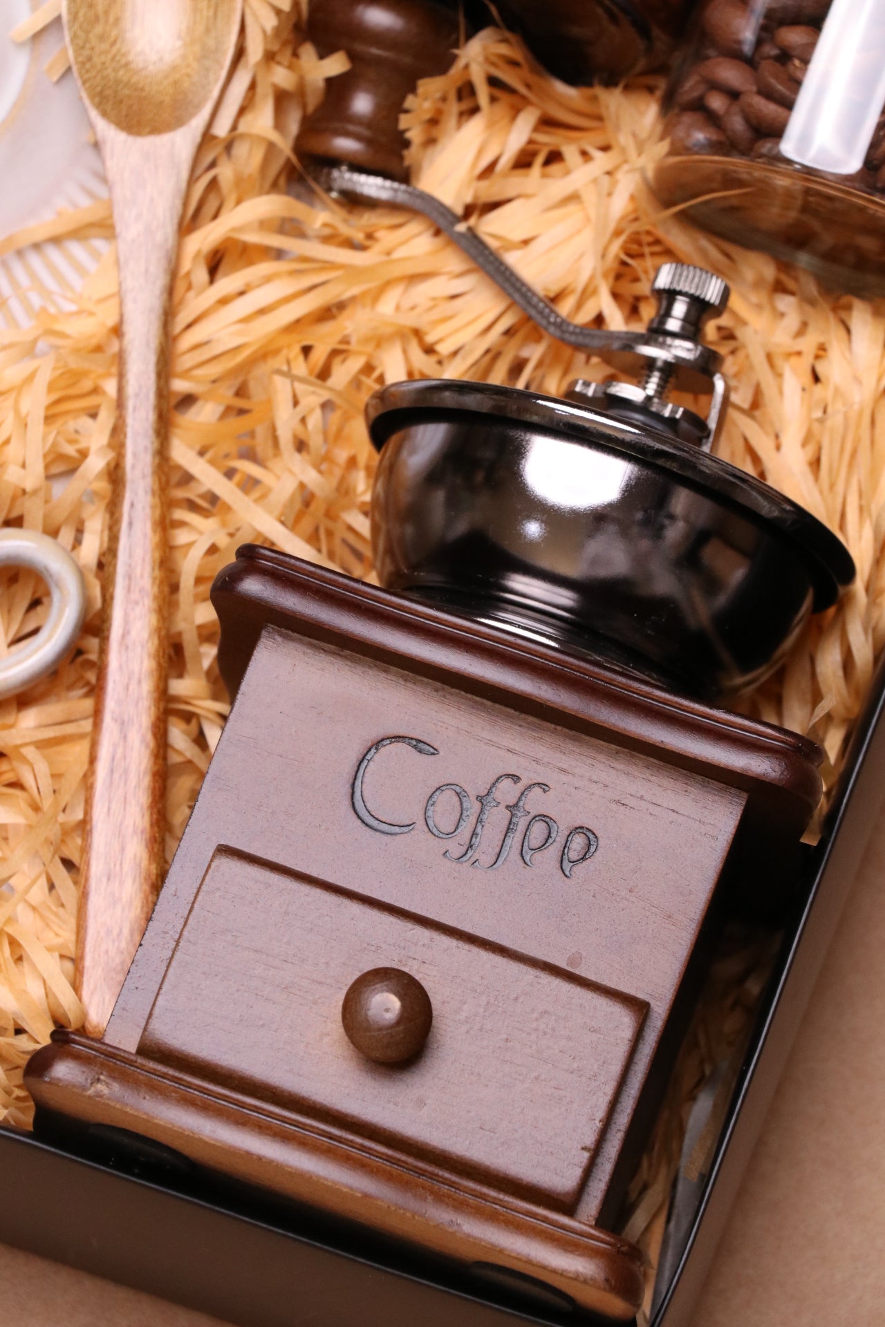 تأتي الهدية بعلبة من حبوب القهوة المختارة بعناية، إضافة إلى مطحنة قهوة يدوية عالية الجودة تُبرز نكهة البن الطازج وتمنح القهوة طعمها الحقيقي.