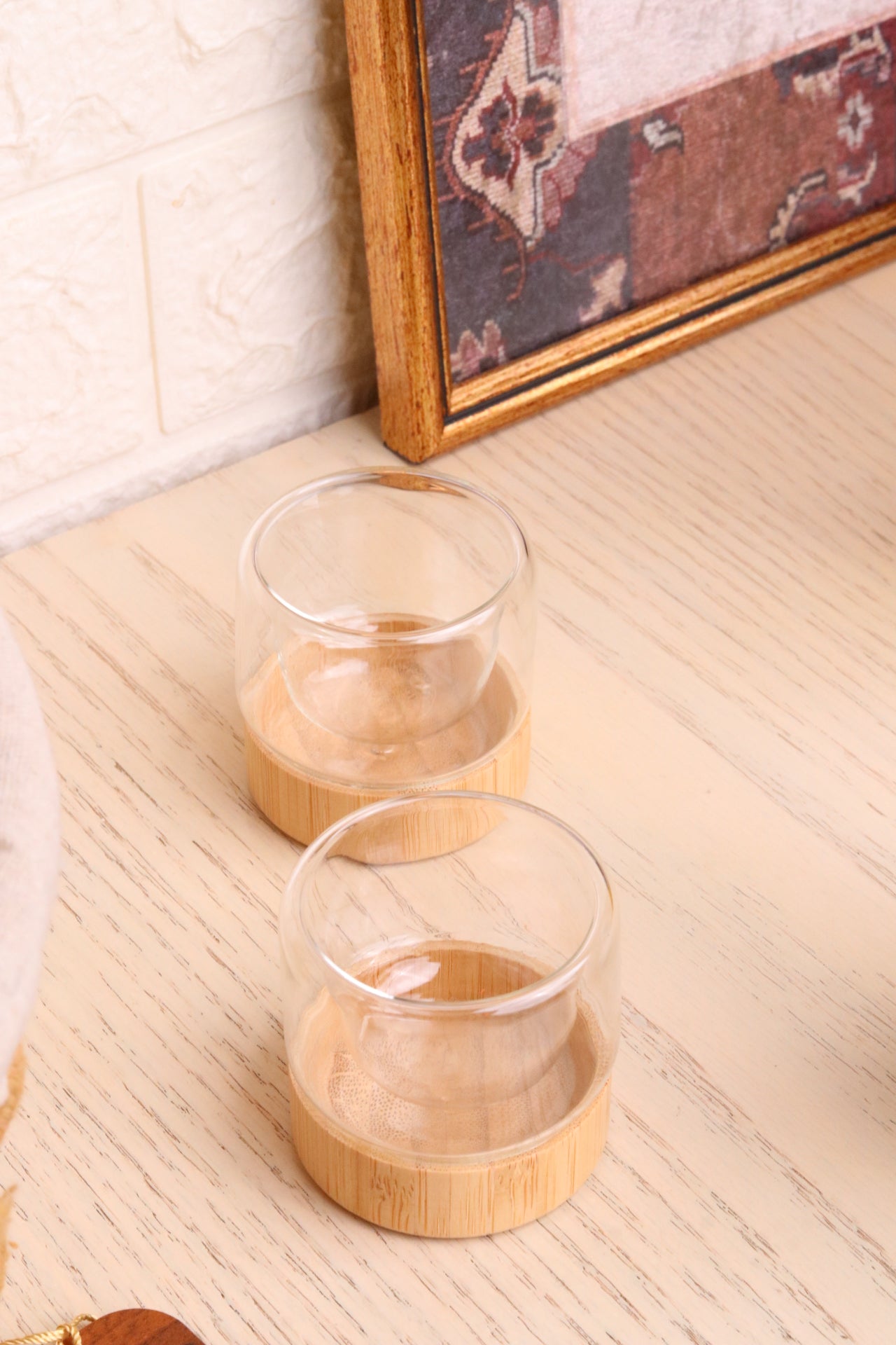 - ☕ فنجانان قهوة عربية (Double Glass) مع قواعد خشبية أنيقة، ليكتمل طقس القهوة بذوق راقٍ.